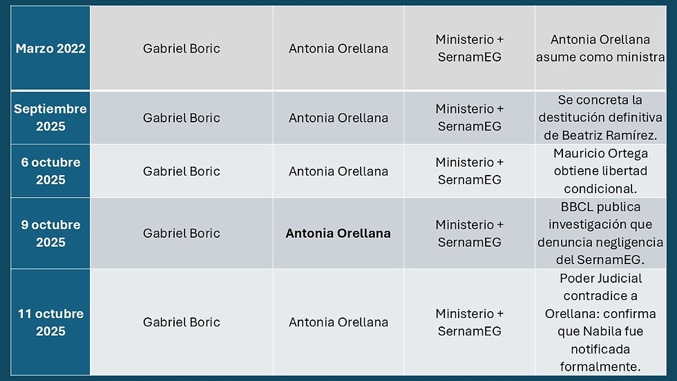 La tabla que se incluye más abajo, reconstruye los hitos clave del caso Nabila Rifo desde el ataque ocurrido en 2016 hasta la libertad condicional de su agresor en 2025. Muestra cómo tres gobiernos y tres ministras tomaron decisiones que, por acción u omisión, dejaron a la víctima sin defensa judicial activa.