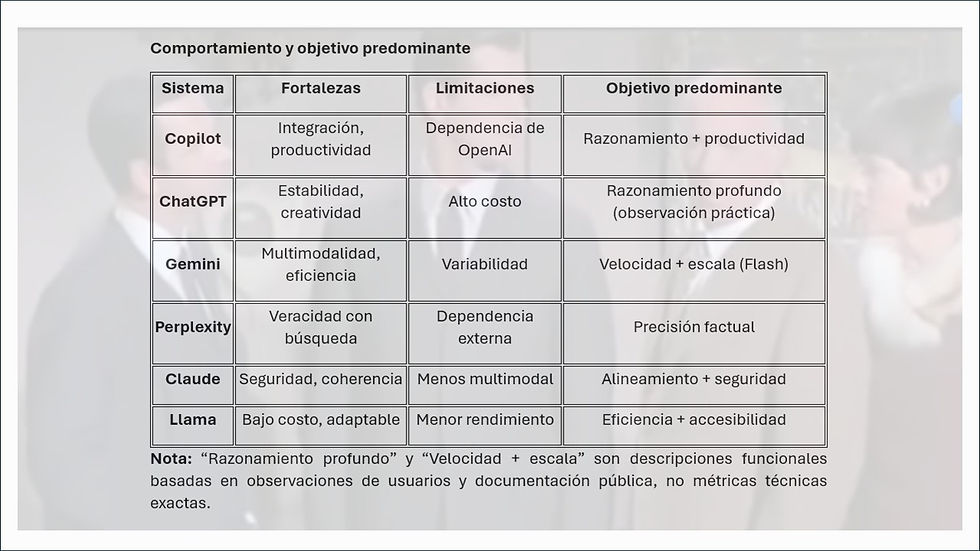 Lo que verán aquí es cómo se comporta cada IA en la práctica. Esta tabla muestra qué prioriza cada modelo: velocidad, razonamiento, veracidad, seguridad o eficiencia. Eso significa que muchos de sus errores no son “accidentes”, sino consecuencias directas de su objetivo predominante. Entender esto sirve para anticipar cuándo una IA puede equivocarse… y cuándo ese error puede hacernos creerle.